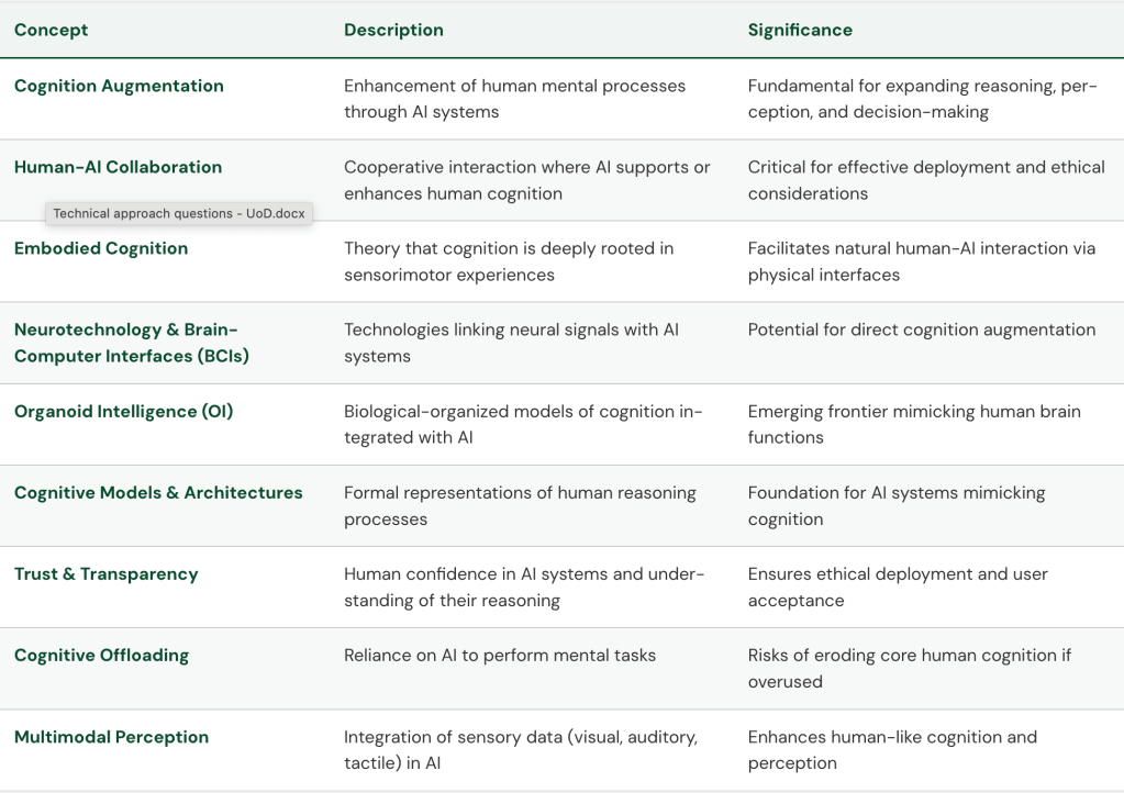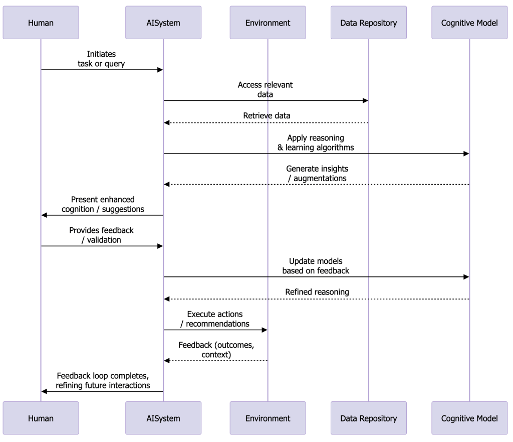 This sequence illustrates a cyclical process where human intention triggers AI-mediated cognition augmentation. The AI system accesses relevant data repositories, processes information through models that mimic or extend human cognition, and presents outcomes for human validation. Feedback from the environment and human responses serve as iterative inputs to continually refine the AI’s cognitive models, enabling increasingly sophisticated augmentation. This dynamic interaction exemplifies the synergistic nature of human-AI collaboration aimed at amplifying cognitive capacities