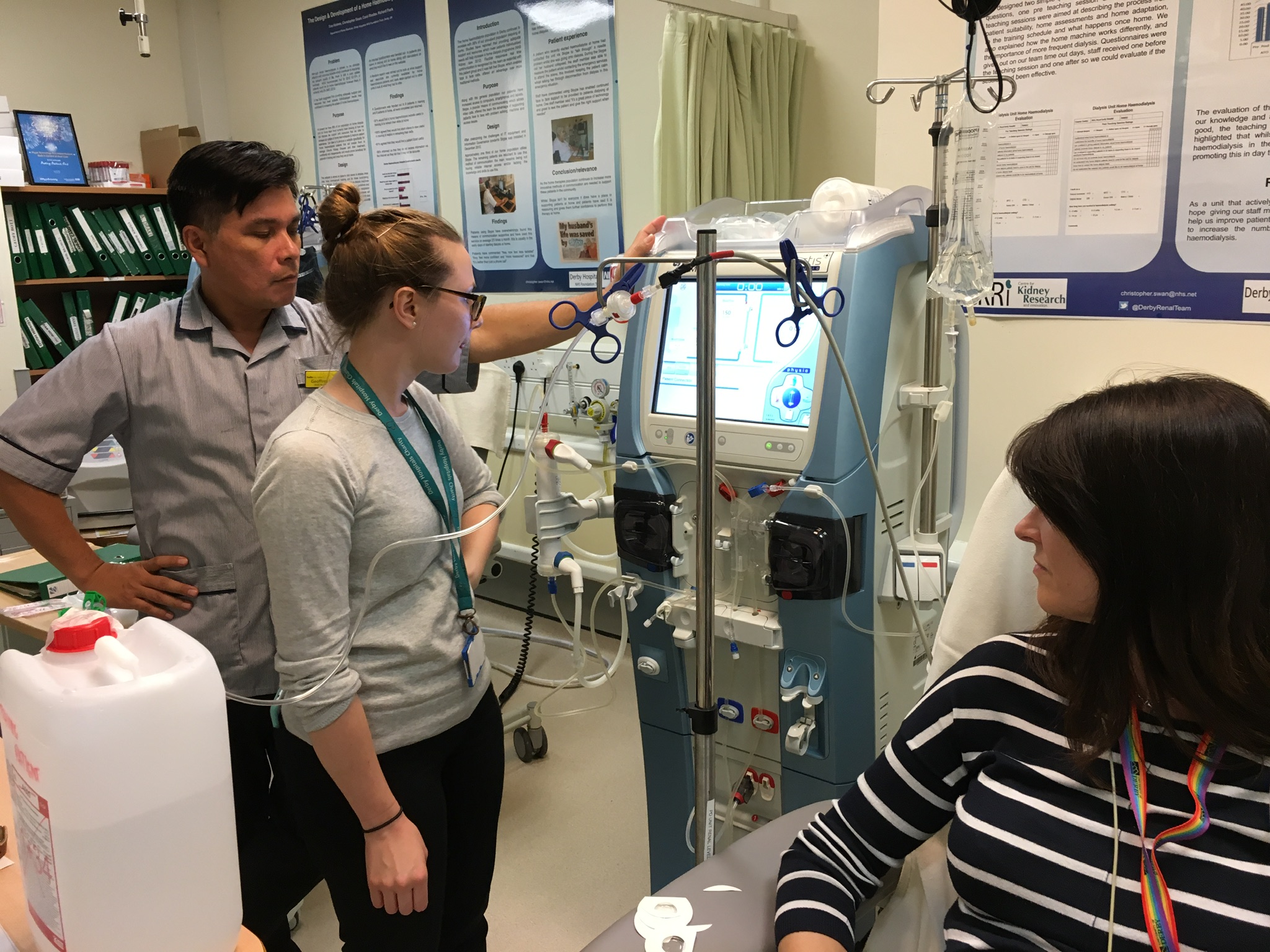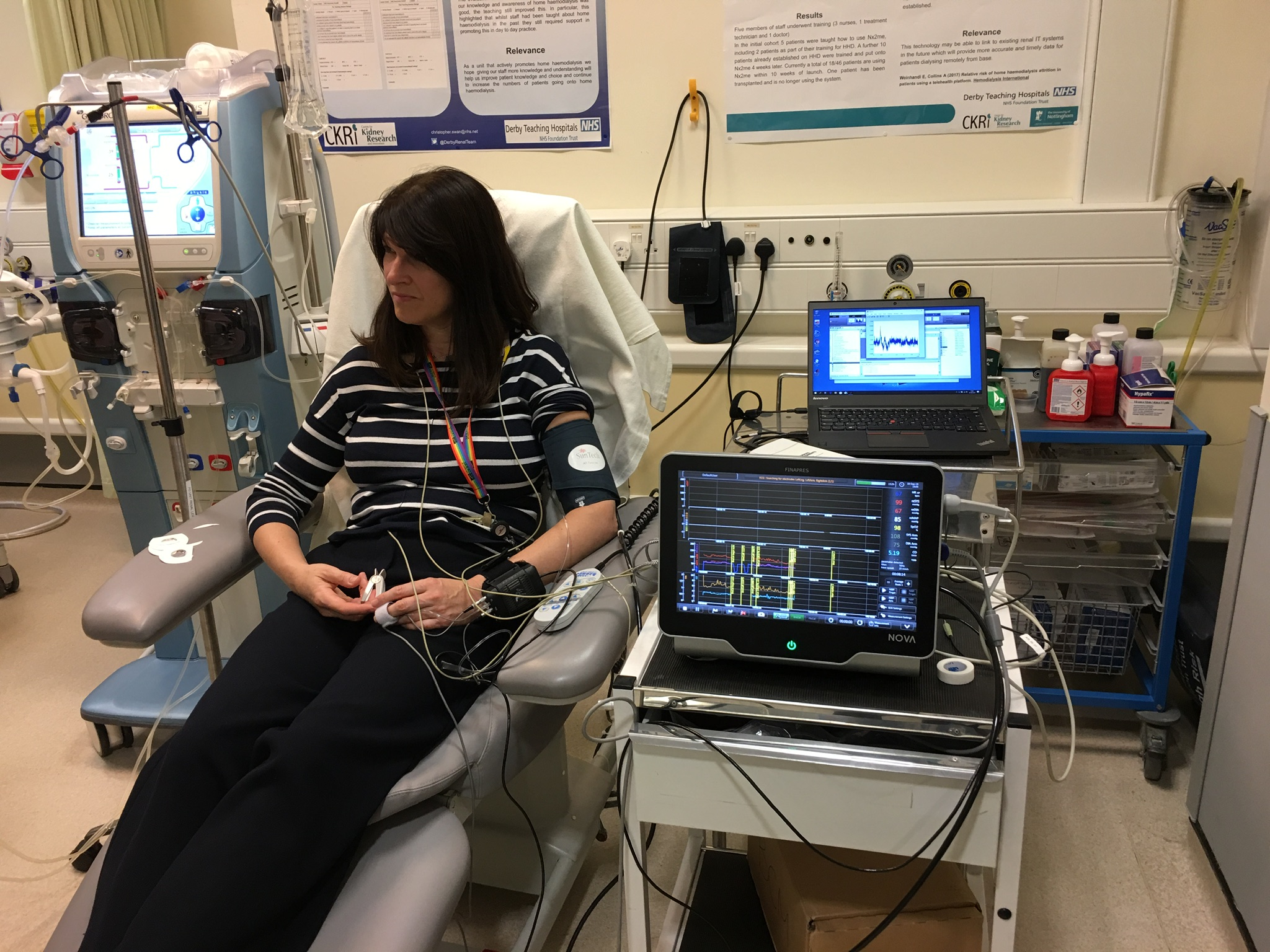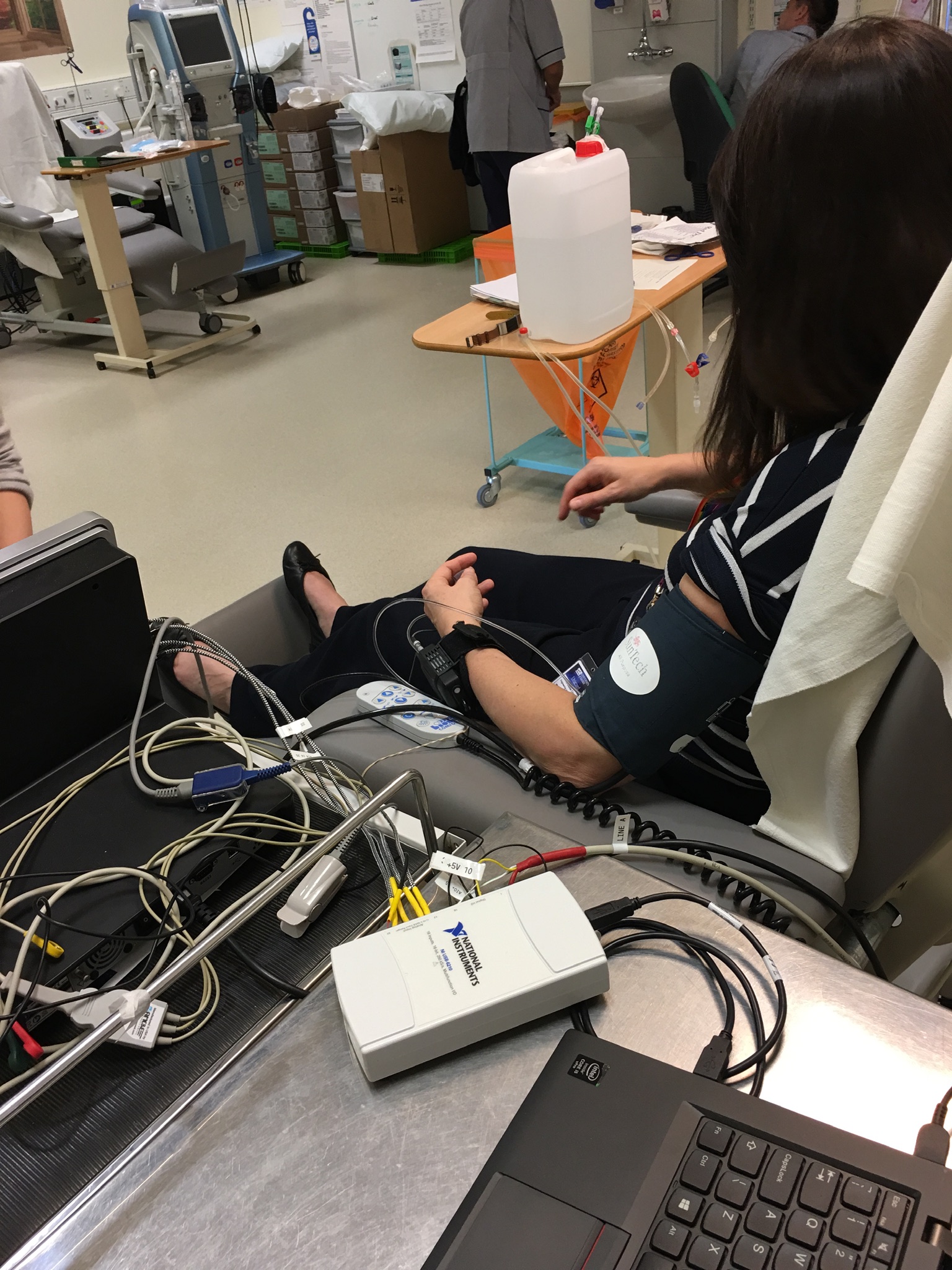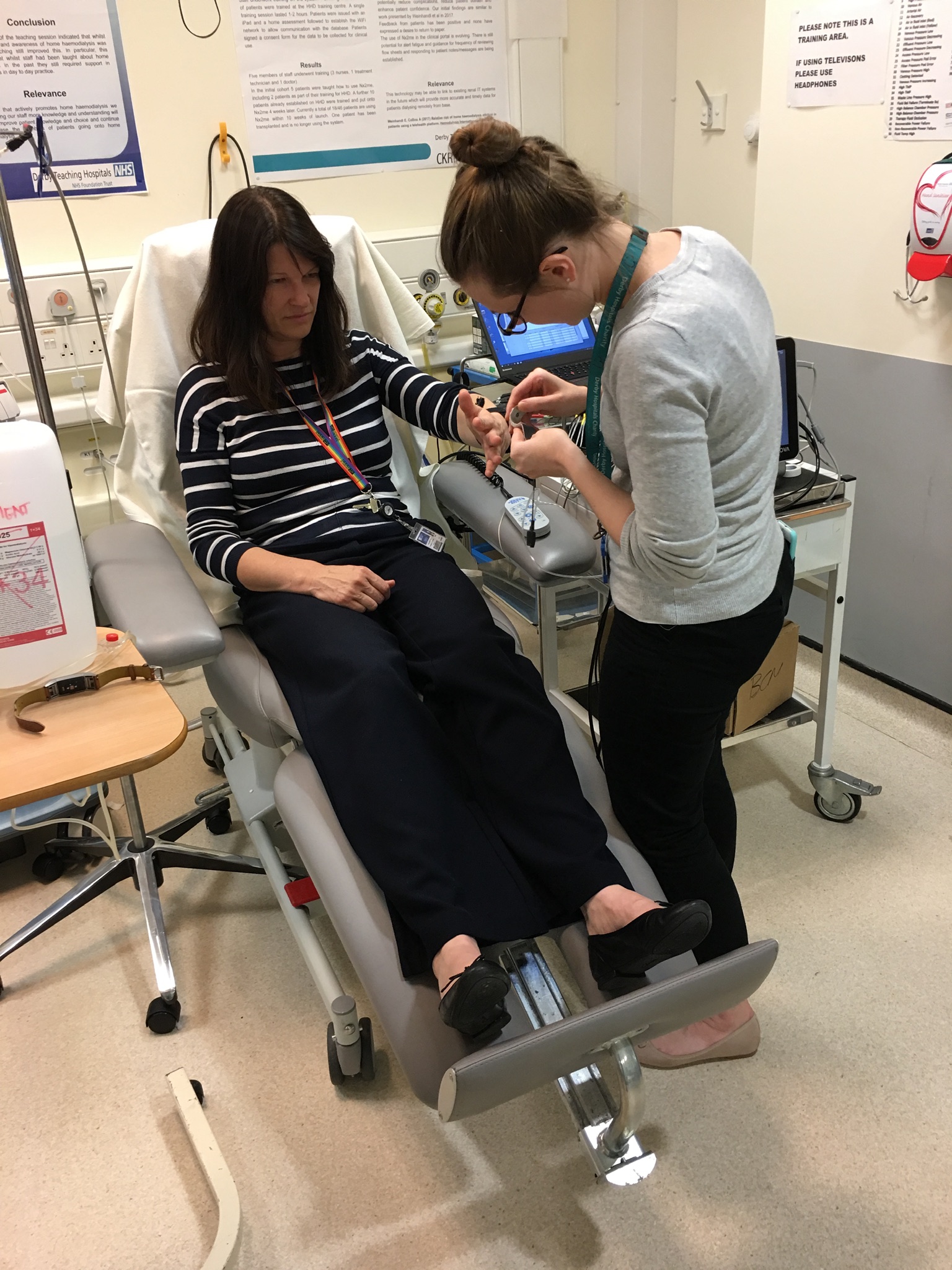 In September 2019 we needed to practice how we would connect, run, and disconnect a dialysis patient and perform real-time data acquisition on the Derby Royal Hospital Renal Unit. So we ran a series of exercises to formalise how the workflow would be implemented. No dialysis actually taking place, but everything was practiced. Many thanks to my able assistant Elke-Louise Crump, and to the Renal Unit’s Dr Bethany Lucas who would work with me in the early delivery of the observational study. Recognition also needs to be given to the nurses and technicians of the Unit.